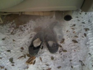 эти мужские грязные сношеные туфли с белыми носками в них я обнаружила у своей машины