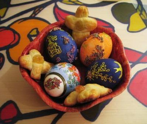 Шлёндра, флаги великолепны.) А я в этом году впервые сама не делала с яйцами ничего - всё, начиная от варки, окрашивания и заканчивая кропотливым украшением неведомыми узорами из мелкого бисера, - делал сын. А ещё он сам испёк вот такие маленькие крестики.. Чему рада - для него это уже не просто игрушки. Спасибо нашей православной бабушке..