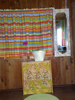 Ну. А я че, отпиралась? Это икеевские комодики, сиречь доски с дырками для болтиков и сами болтики. И салфетки икеевские. И шторка самошитая мною из икеевской ткани, из нее предлагалось шить для детей постельное белье.