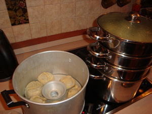 Когда манты были уже готовы, обнаружилось, что про соусы все забыли. Пришлось раскулачивать хозяйку, и она достала все заветные баночки-скляночки из холодильника.