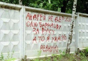 ну вообще-то на заборах пишут разное. И часто даже не ругательства. Вот там где я живу уже лет10 красуется надпись: С добрым утром, любимая! И эта надпись регулярно обновляется. Значит до сих пор любит и написано напротив окон той, кому эти слова обращены, и она это читает, я думаю - радуется. Иногла мне кажется, что они уже и поженились, а он все пишет это)