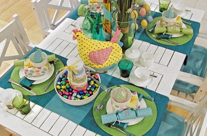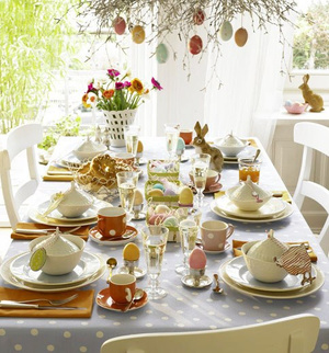 Я вот нашла очень яркую весеннюю посуду за гуманные деньги, купила новый лен на скатерть и еще придумала для своей курочки новое гнездышко-там будет свежая травка, а в травке яички)))