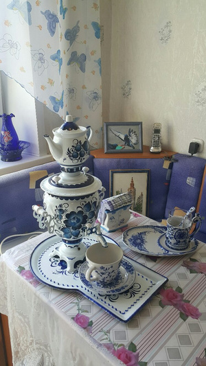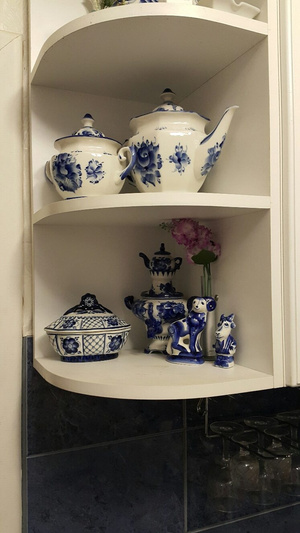 Здесь синие узоры на тарелках в стиле прованс, тоже ничего.
