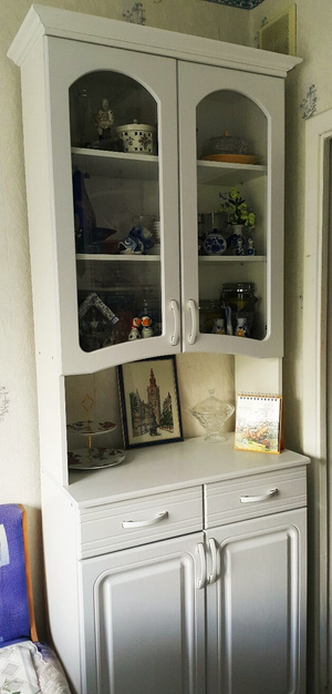 можно немного апеллировать его к провансу, если заменить ручки.. выбрать ручки либо старого металла и бабушкинской формы, либо ручки-пуговки, крашеные , да старёные, либо те же пуговки выделать из дерева на токарном станке, что интересно и процессом, да и заморить потом - будут выглядеть штучнее и дороже , да и не таким частоколом, как сейчас.. а когда ручки появятся, тогда уже и занавесочки ..имхо.