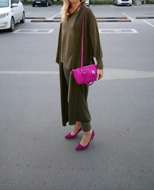 Было бы отлично, если бы фуксия в этом ансамбле осталась одна, и пусть бы лучше это были туфли. Образ выиграл бы, приобрел бы экспрессивность. Фигня на шее интересная и вполне уместна.
