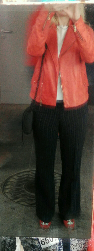 5. Да, и каблук такой носят с драными джинсами или шортами на полупопу, но никак не с брючатами... Получилась учительница младших классов 80-х годов. Конкретно эти туфли - только с ярко-голубым рваным денимом, подвернутым так, чтобы была видна щиколотка (которую вы здесь безбожно закрыли зачем-то, а так еще хоть как-то вытянулся бы вид)