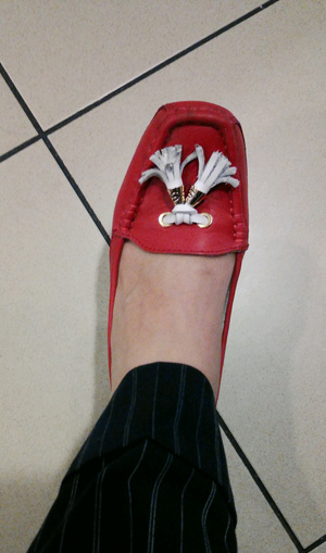 Но у меня каждый раз вопрос. Потому что цвета я абсолютно не чувствую. Вот, допустим, красное платье. Белый (скорее, молочный) жакет. Туфли? Ну, допустим, телесные - они какбэ универсальные. Но у них черный задник (я не знаю, как называется эта пяточная часть с каблуком )))) ) А сумочка?