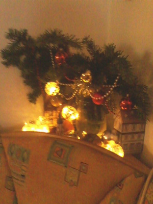 А пока скромненько повесила там-сям пару дешёвеньких шариков из местного китайского магаза ))) Гирлянды покупать не хочет, говорит, ну когда-нибудь ты найдёшь эту коробку с игрушками ? )))