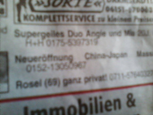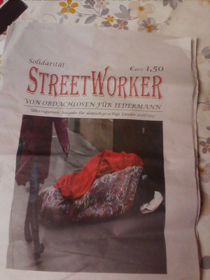1. На этой фотке газета, которую я купила у бездомного "нищего". Они могут обратиться в специальную редакцию, которая повесит им бирку на грудь с указанием имени, а какой-то процент за проданные газеты они могут оставить себе. В газете напечатана всякая муть о романтических, но горьких буднях немецких и не очень бездомных, я пробежала глазами просто. Стоит 1,5 евро за 4 листа.