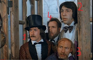 Номер 1, два, и три - вроде вполне узнаваемые личности. Но! Номер один (Владимир Зельдин?) в 1978 году, когда вышел фильм, был весьма в почтенном возрасте(78-15=63 года), а в кадре он как молоденький огурчик, выглядит гораздо моложе даже номера четвертого (Лев Дуров?).