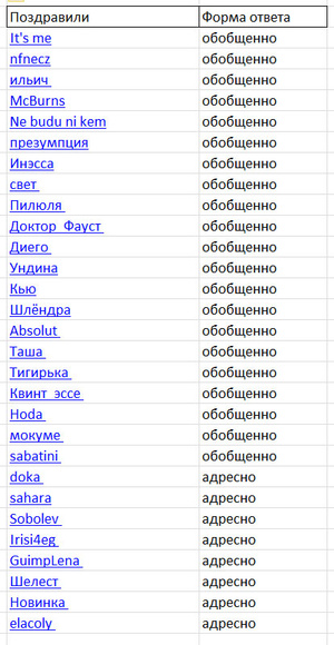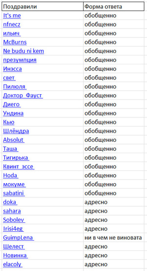 Смотри, кому она НЕ ответилаПровел небольшой анализ. Большому количеству людей она отписалась обобщенно, одним постом, поблагодарив всех. Тех, кому ответила лично, адресно, я выделил в таблице. Твой способ тут не работает![]()