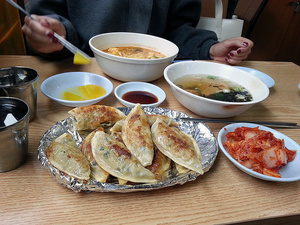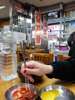 На стол всегда бесплатно ставятся панчханы (закуски): ким-чи, маринованный дайкон, водоросли, листья всякие, много всего, в разных заведениях разное по составу и по количеству, только кимчи всегда обязательно присутствовал.