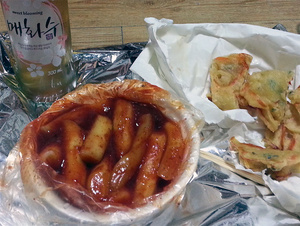 Ттокпокки – колбаски из рисовой муки в остром соусе. Очень вкусно. Остро, конечно, но вкусно. Цена что-то около 3-4 тысяч вон за порцию.
