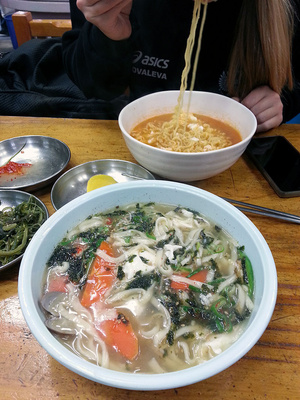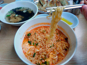 Я заказала пибимпаб, а она – рамен. Собственно, она хотела что-то с бульоном и ткнула в картинку с бульоном. Я не знаю, как бы сложилось её корейское кулинарное приключение, если бы не это первое ее истинно корейское блюдо на корейской земле. Как потом оказалось, это был рамён. Очень острый, крепкий…Она мужественно съела все. И прокомментировала: Словно в космос без скафандра слетала. Но вкусно. Знала, что здесь все острое, но чтоб так…
