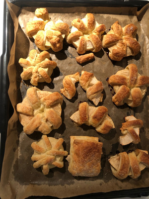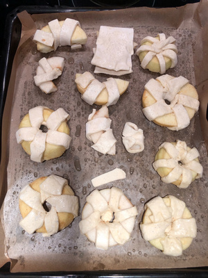 опять от оли табу) тесто дрожжевое слоеное (юля высоцкая), яблоки разные, сбрызнуть водой и посыпать сахаром. и совсем необязательно эти кольца крутить, замаешься, ломаются, по итогу полукольца даже есть удобнее. вышло очень вкусно, все съедено) хотя на вид было страшненько)