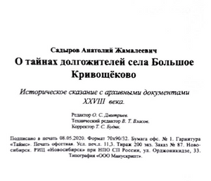 из книги: Садыров Анатолий Жамалиевич_О тайнах долгожителей села Большое Кривощёково.Историческое сказание с архивными документамиXVIIIвека_Новосибирск_РИЦ.НПО.СП.РФ_2020_284с