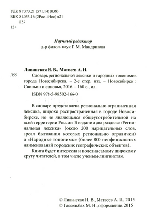Ливинская Ирина Владимировна,Матвеев Александр Игоревич_Словарь региональной лексики и народных топонимов города Новосибирска_Новосибирск_Издат.«Свиньин и сыновья»_2016_160с.pdf