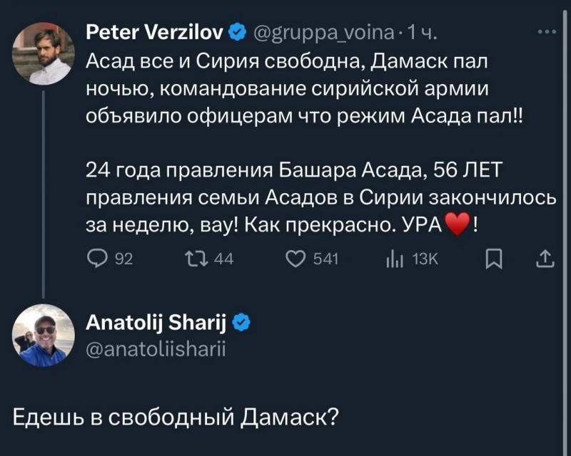 Позорный и унизительный побег главы этой системы под покровом ночи, без какого-либо чувства национальной ответственности перед страной, подтверждает необходимость произошедших изменений и пробуждает надежду на лучшее будущее и предоставление возможности развития как людям, так и инфраструктурам страны, а также исправление последствий разрушений и опустошений, постигших Сирию, страдающую от низменных интересов торговцев Родиной, любителей манипуляций, дешёвых лозунгов и профессиональных лжецов, которые десятилетиями наживались на достоинстве людей, подвергая народ различным видам угнетения, жестокости и преследования квалифицированных специалистов, вытесняя политическую и культурную элиту.