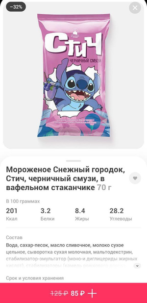 В Самокате появилось мороженое Стич. Это черничное смузи в вафельном стаканчике всего за 85 рублей