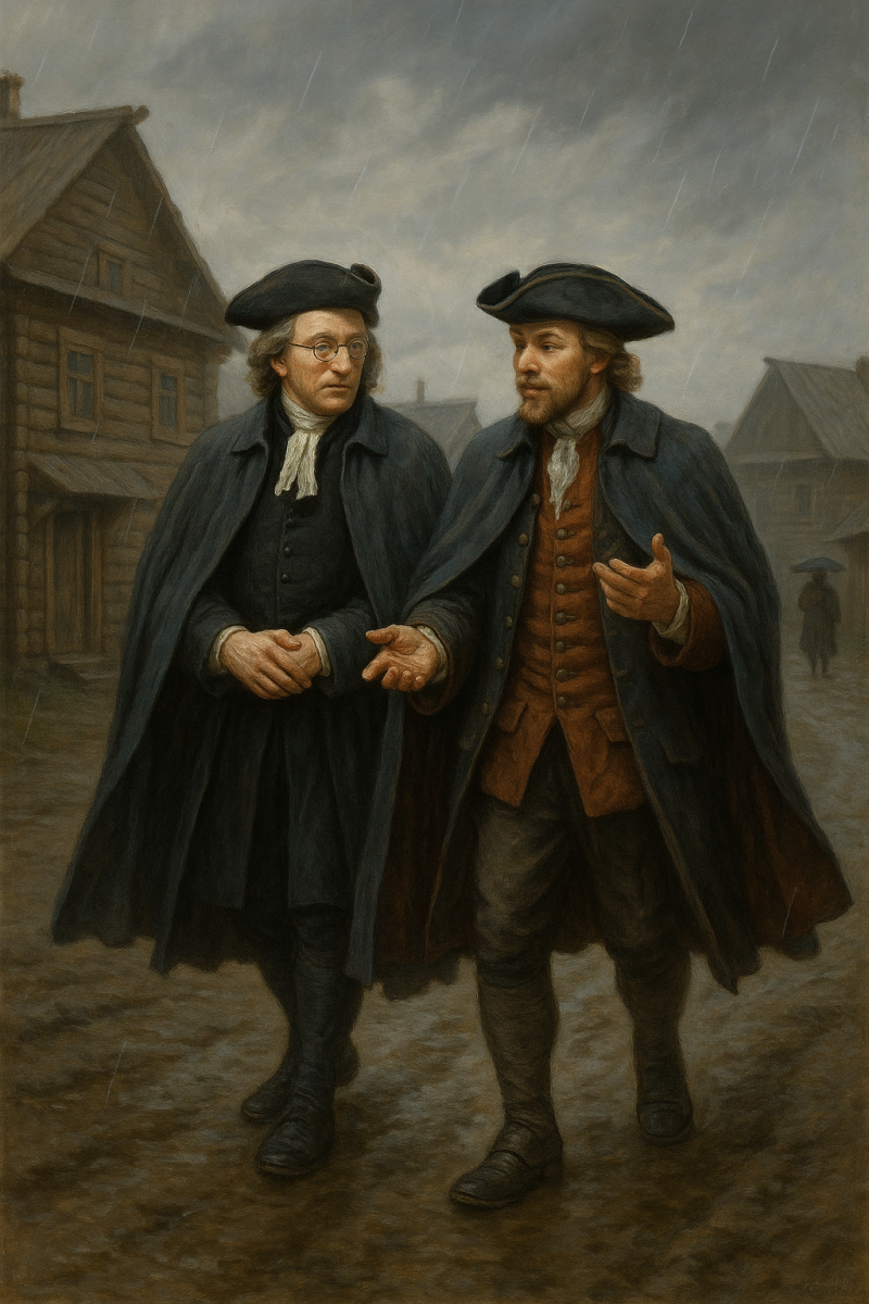 рисунок: господин доктор Мессершмидт и господин комендант беседуют в резиденции доктора. Господин комендант рассказывает доктору про племена татар. За окном пасмурно.