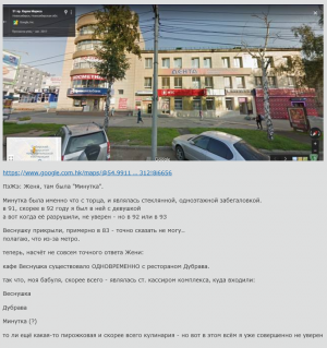 ...Минутка (ресторан Дубрава)Ресторан "Дубрава" первоначально был кафе "Веснушка", а "Минутка" - это была забегаловка с торца здания, в котором этот ресторан размещался. Эту забегаловку потом снесли.