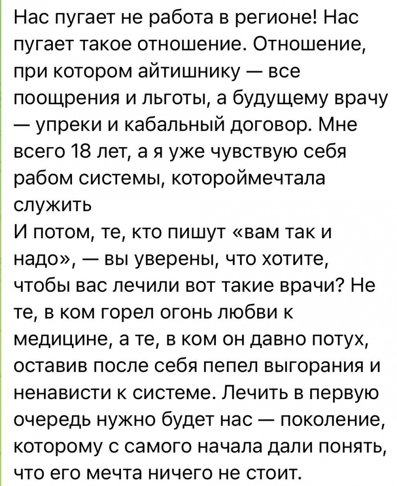 надо же... 18 лет человеку, а как уже настрадался прям 300 баллов и всю жизнь хотел стать врачом и не боится регионов, а намучался. Ты, Леш, напиши человеку, что пусть учится не ссыт, мы в хорошее ЛПУ пристроим.