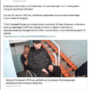 Добрый вечер. Проблема с подъёмником осталась, как и была. На сегодняшний день у нас проблема другая. Неделю назад мне сделали операцию в флебологическом центре. Можно было сделать бесплатно, но это долго. Учитывая, что мы с сыном живем в вдвоем, пришлось сделать операцию быстро, но за деньги(утром уехала, после обеда приехала),пришлось взять кредит на 30 000р. предстоит операция и на второй ноге. Учитывая состояние моего здоровья мы с сыном подумали и решили, что подъемник подождет, а вот кровать с механическим подъемом изголовья нам необходима. Аркадий крупный молодой человек и поднимать изголовье в ручную с моим здоровьем становится все труднее. У нас и так было очень не просто с финансами(регулярные визита платного доктора на дом, дорогие лекарства для сына и недешевые витамины сейчас уже для нас двоих),а теперь еще выплата кредита за операцию, все это огромная проблема для нас. Аркаша нашел подходящую функциональную кровать с механическим подъемом,будем копить на нее, но на это уйдет очень много времени. Форумчане нам помогают кто как может. Низкий всем поклон, спасибо.