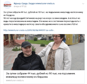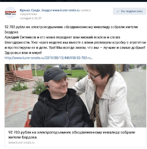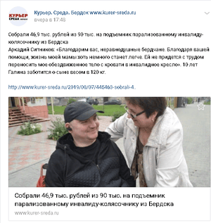 Аркадий все так же ведет активную общественную работу с инвалидами-колясочниками. На днях мы впервые за долгое время смогли выбраться на прогулку.Погуляли по парку и зашли в магазин. Спасибо волонтерам из МЦ "100 Друзей". Без их помощи нам было бы очень сложно выйти из дома. Спасибо всем.