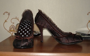 пристраиваю туфли, мне малы. темно-коричневые, абсолютно новые. размер 37,5-38. внешняя сторона - тканевая. колодка удобная. каблук примерно 9,5 см