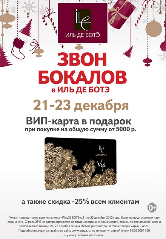 21, 22 и 23 декабря во всех ИДБ VIP карта в подарок при покупке на сумму от 5000 рублей, а так же скидка 25% на все товары*!