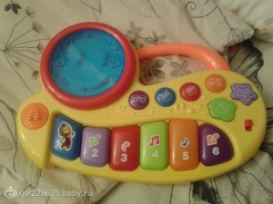 Пианино простое, выбирала в магазине, там несколько клавиш и кнопки, плюс огонки мигают, я ей давно купила, она до сих порт с ним много играет. Еще поющий телефон любит, и игрушки мягкие которые песни поют. Слушает внимательно)) Можно отвлечь на пару минут)