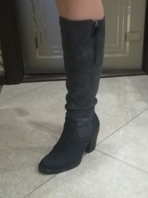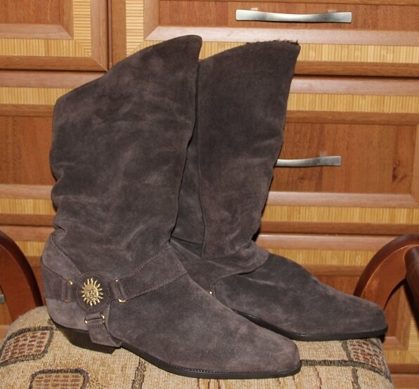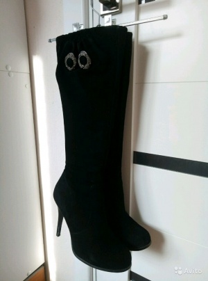 Продам сапоги из натуральной замши, еврозима. Надевала несколько раз "на выход", состояние хорошее. Набойки под замену, каблуки можно подкрасить. Стельки вынимаются, молнии рабочие, все стразы на месте, серьезных потертостей замши нет, если освежить спрей-краской, то будут выглядеть как новые. Высота каблука 10см.
