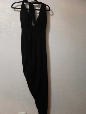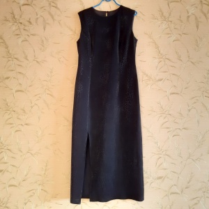 Пристраивается вечернее чёрное платье-футляр с вырезом сзади. Размер примерно 50-52.Обхват груди 100 см. талия 88. Бёдра 108. Материал тянется на несколько см. Цвет однотонный, но фактура ткани пятнистая, за счёт этого создаётся эффект леопардового перелива. Длинна по спинке 130 см.