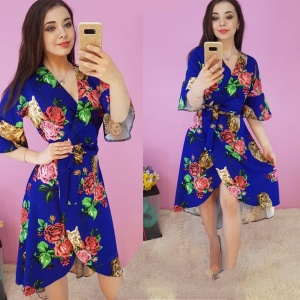 Рукава длиной 3/4, отрезное по линии талии, юбка расклешенная. Модель на скрине высокая, длину смотрите по замерам