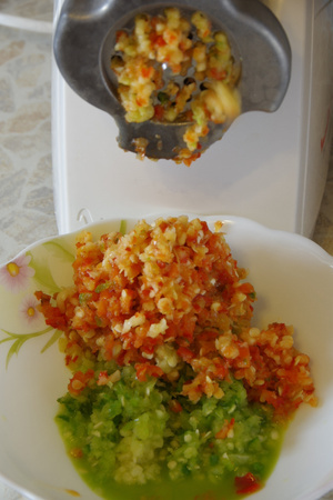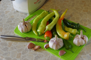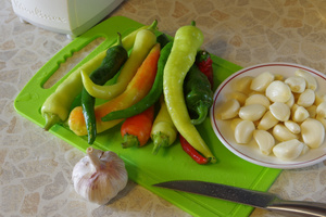 В общем, берете свежий жгучий перец и перекручиваете его с чесноком (лучше своим или местным - китайский порой зеленеет) в пропорции 1:1 (или как вам больше нравится). Раскладываете по небольшим баночкам и храните в холодильнике безо всяких пастеризаций-стерилизаций. Только баночки и их крышечки на всякий сначала ошпарьте кипятком и этого достаточно.