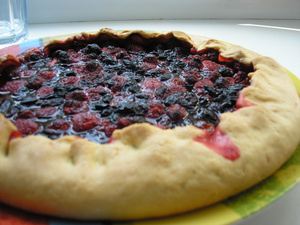 Из муки, холодного масла, сахара, соли и воды завести тесто. скатать в шар и минимум на час в холодильник. Потом размять руками в форме, чтобы края выступали. На тесто - любую ягоду, я брала в этот раз клубнику и жимолость, сверху - сахаром посыпать и закрыть ушками теста. Тесто можно смазать молоком, будет красивее, я забыла. На 30 минут в духовку. Идеальный ужин для жаркого дня, особенно с холодным молоком.