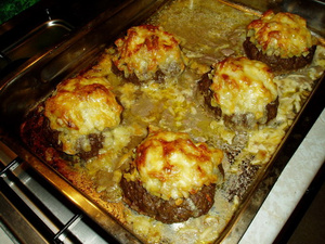 Купила биточки в ленте, свежие, не замороженные, и замороженные грибы. Биточки в посудину, сверху грибами засыпала, чтобы их на видно было, как грибы подтаяли в духовке, добавила сметаны. ВСЕ!