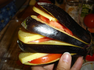 Взять баклажаны с плодоножками, разрезать вдоль на 4 части, не прорезая плодоножку, в разрезах посолить, поперчить, положить кусочек сыра и помидорки. Баклажанчики плотно выложить на противень, посыпать давленым чесноком и смазать майонезом. Поставить в прогретую духовку минут на 45 (в течение этого времени духовку не открывать). Если баклажаны останутся жестковаты, можно и подольше.