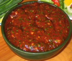 Мелко покрошить 2-3 головки репчатого лука, 2пучка киндзы и по 1 пучку укропа и петрушки. Смешать с 0,5 л. томатной пасты, посолить по вкусу.( если паста была густая развести соус минералкой или простой водой). Всегда идет на "Ура!"![]()