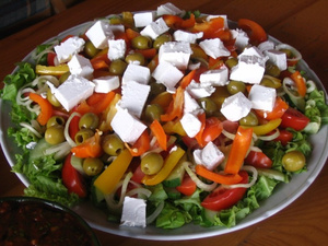 Все как обычно : листья салата крупно порезала, огурцы,помидоры, лук репчатый, сладкий перец - полила заправкой ( оливковое масло, сок лимона, соль, выдавленный зубчик чеснока). Сверху оливки и брынза.