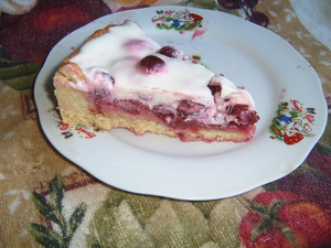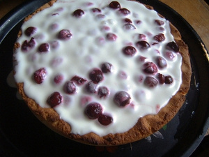 Из 0,25 уп. сметаны (20%, кажется, Домик в деревне) и 0,5 ст. сахара взбила сметанный крем. Кремом залила вишню, сколько влезло, и поставила в холодильник. Через час крем уже основательно загустел, и пирог можно было есть.