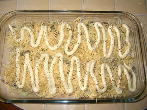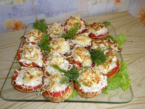 кружочки выкладываются на противень,слегка смазываются майонезом