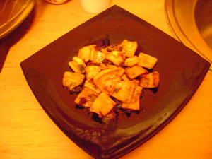 Тушки кальмара очищаются, режутся средними кусочками (квадратами, ромбами, прямоугольниками - как получится) ~ 5 х 5 или 7 х 7 см. Слегка надрезаются с одной стороны крестообразно (решёткой).