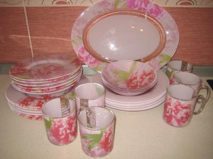 6 плоских тарелок диаметром 25 см, 6 плоских тарелок диаметром 22 см, 6 глубоких тарелок диаметром 24 см, 3 глубоких тарелки диаметром 16 см, 6 кружек диаметром 8 см и высотой 9 см, 1 блюдо плоское 26*35 см. Всего 28 предметов.