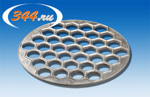 это такой железный круг с дырочками. Сам процесс приготовления довольно трудоемкий. Раскатывается тонкий пласт теста, ложится на пельменницу, потом в места, где дырочки раскладывается фарш, потом сверху еще тонкий пласт теста и скалкой укатывается по пельменнице.