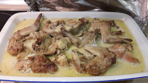Я его просто в сметане тушить буду, без излишних сложностей. Много лука - кролик кусочками - сметана - тушить. Как-то отчаянно лень все в этом году:)))