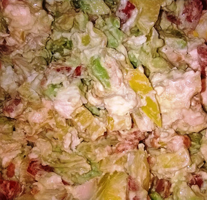 )Все перемешиваю, перчу, добавляю оливковое масло. Да, согласна, выглядит не ахти - но вкусно обалденно. Тонкая нотка копченого куриного филе идеально сочетается со вкусом свежих овощей и сыра. Думаю, можно фаршировать этим салатом листья листового салата, так будет намного красивее.