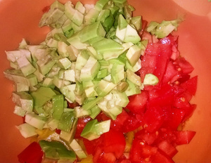 Беру 1 авокадо, или вилкой разминаю, или в блендере на самой маленькой скорости. Туда немного лимонного сока, иначе авокадо потемнеет, 1 свежий помидор (в блендере (шкурку снять), или на терке, или мелко порезать), 1 маленький зубчик чеснока, 1 десертная ложка оливкого масла.