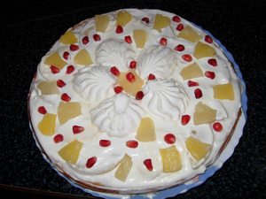 Промазываем сметанным кремом и прокладываем резаным зефиром и консервированным ананасом.