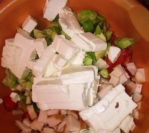 Все порезать кубиками, перемешать, заправить оливковым маслом, при желании - поперчить. Солить не нужно - в сыре достаточно соли.